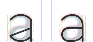 Now for lowercase letters. We take the unit square (blue) and create a smaller construction motif (green) of size 'x' centred at the bottom: